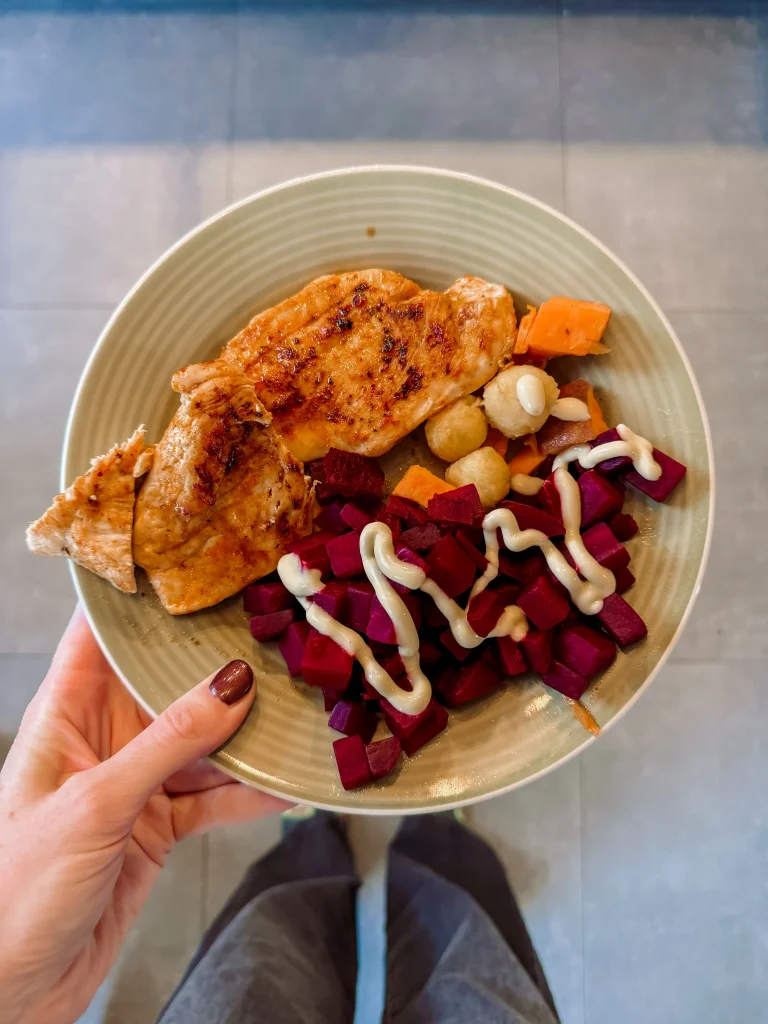 Deze rode biet met gemarineerde kip en zoete aardappel is zo onwijs simpel en staat binnen no time op tafel!